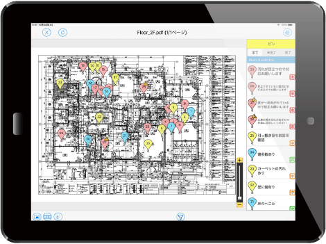 検査項目は、担当するメンバー毎に、図面上にピンを立てて管理。ピンの色により、未是正・是正中・完了などのステータスが色分けされるので、現場横断的なステータスを一目把握でき、管理業務の効率化と合わせて、検査漏れの防止を実現。