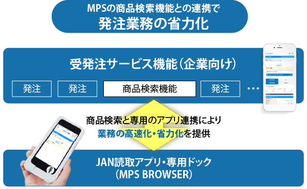 クラウド型受発注システムMPS専用アプリ。バーコード読取による商品検索で発注ミス防止。様々な形式なオプション・デバイスの利用が可能。
